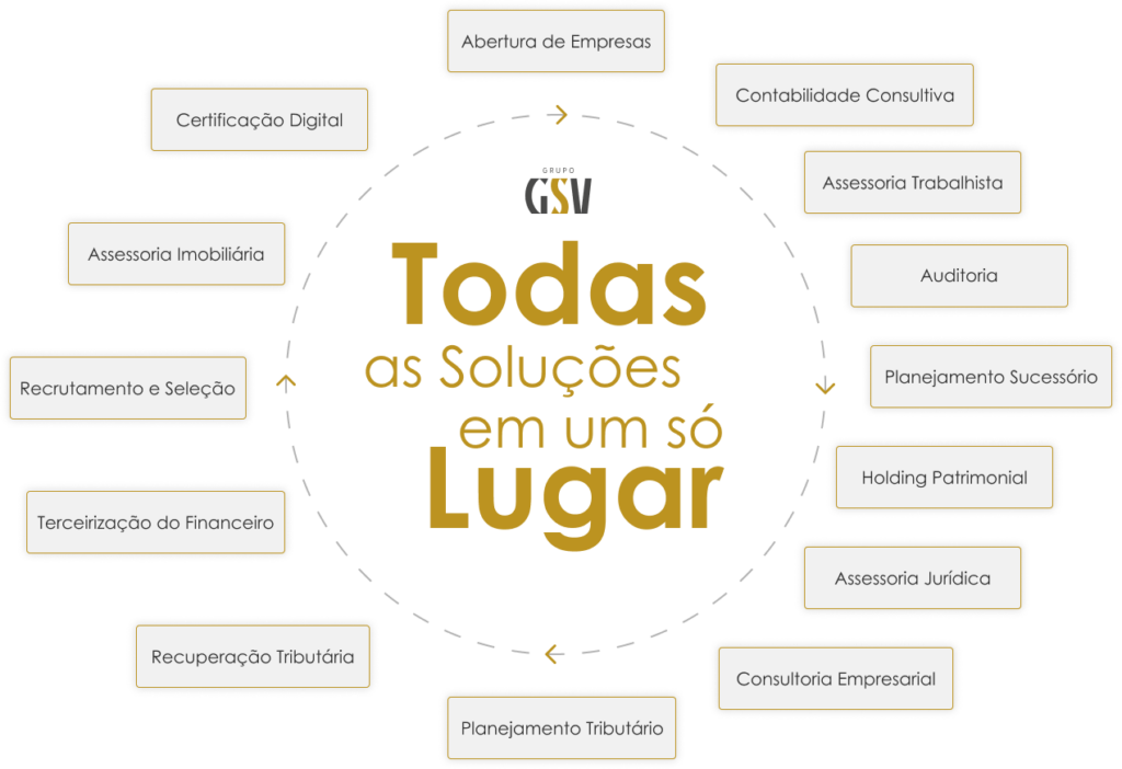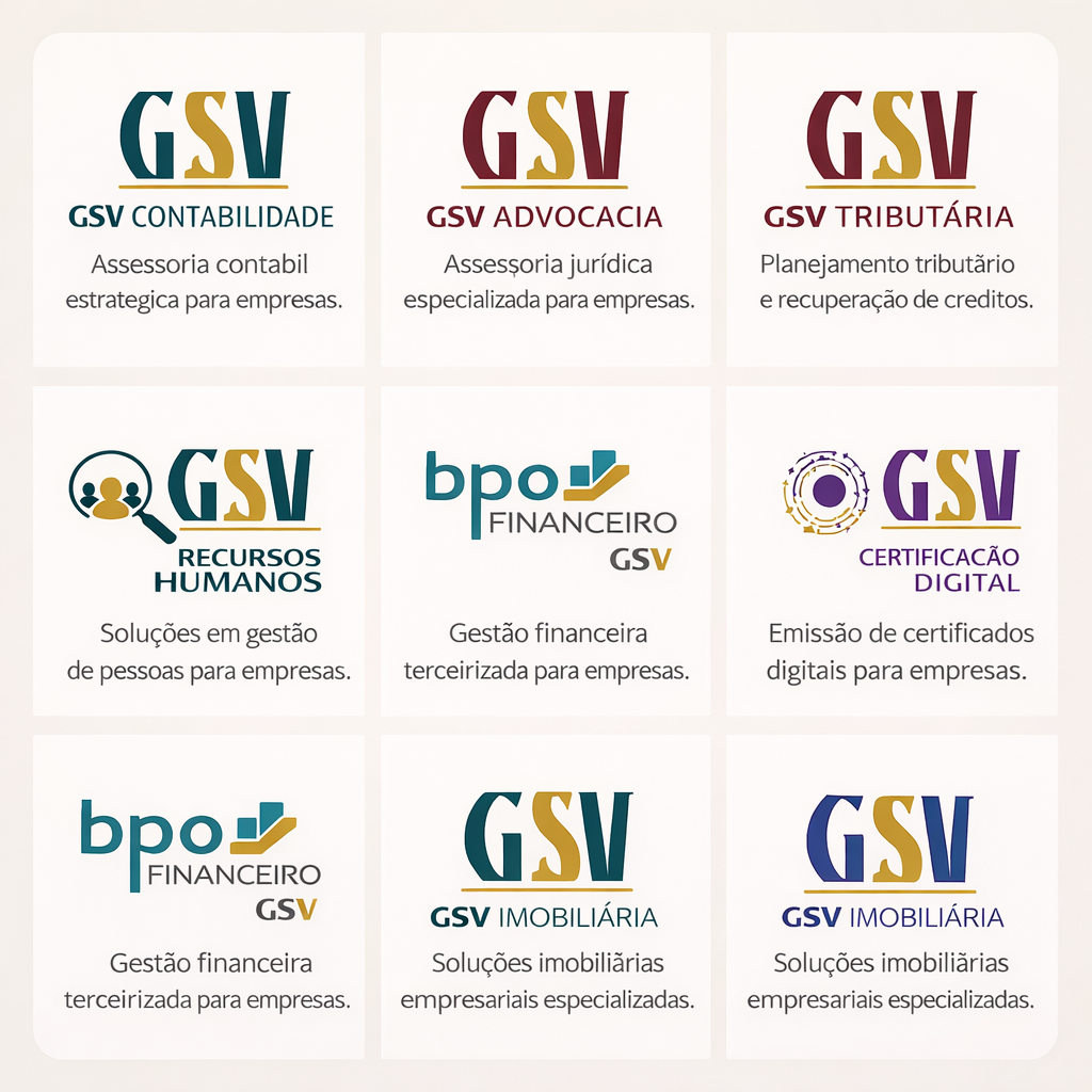 O Grupo GSV é uma organização com especialidade nas áreas de Contabilidade, Advocacia, Consultoria Empresarial, Financeira e Tributária, Recuperação de Créditos Tributários, Imobiliária, BPO Financeiro (Terceirização do Financeiro), Certificação Digital, Recursos Humanos, todas integradas numa sede própria.